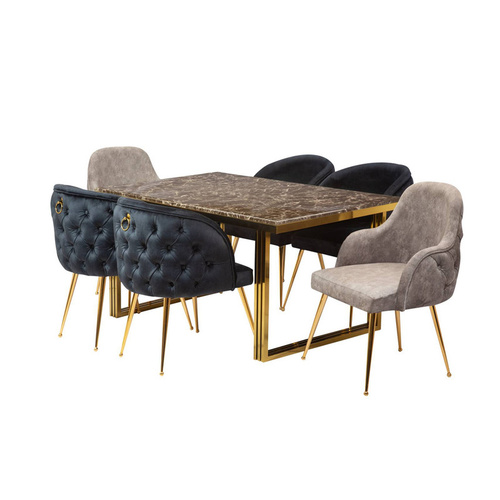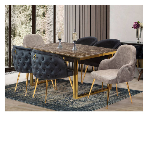 مدل ویلتون از دو مدل صندلی تهیه شده و طبق تصویر دوعدد صندلی میزبان به یک شکل و رنگ طوسی روشن و 4 عدد صندلی به یک شکل دیگر و رنگ سرمه ای میباشد